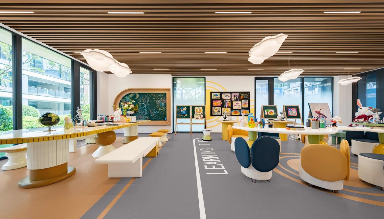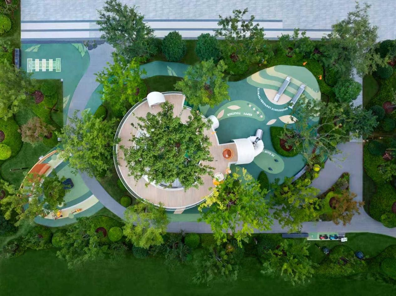 高阶社交从不是刻意的排场,是自然的相遇,而这份“自然”,更延伸到全龄段的需求里:户外儿童乐园的软质地垫,让孩子奔跑时无惧摔倒;林下会客厅的蓝翡翠奢石桌台,是邻里聚会、接待亲友的好去处;架空层的四点半学堂摆着小桌椅,还有棋牌室的暖光,让每个年龄段都能找到属于自己的角落。
