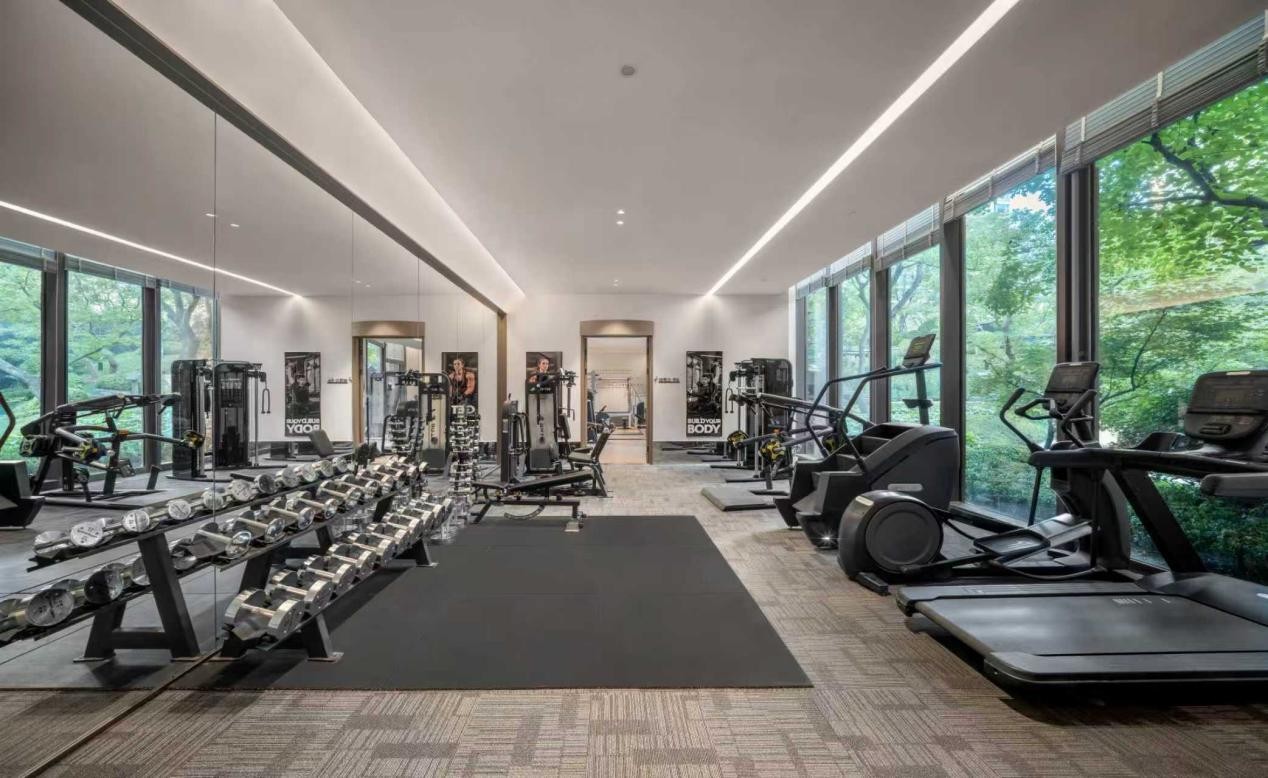 唐忠汉大师设计的约1500㎡安缦风会所,藏着和樾府对高阶生活的理解:没有浮夸的装饰,只有恰到好处的松弛:健身房的器械临窗摆放,锻炼时能看见园林的绿意流转;茶室的桌面泛着温润的光,煮茶时的水汽与窗外的树影相融;私宴厅适合两三好友小聚,也能承载家族宴请……