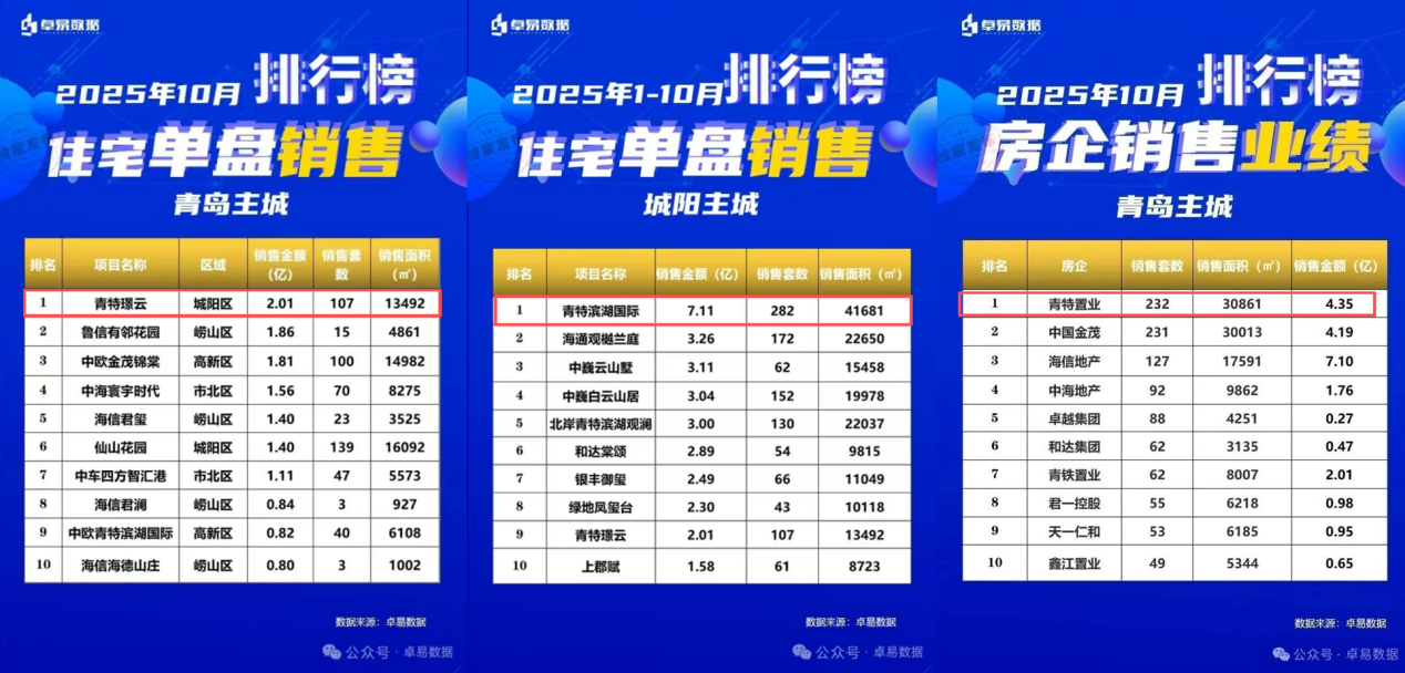今年以来,这一高效节奏不断转化为扎实的经营成果:青特璟云5月21日拿地、10月12日首开,一举刷新近两年青岛市首开套数销冠;此前,青特滨湖国际二期亦在去年拿地后5个月内首开,成为年度首开项目“套面金”销冠。