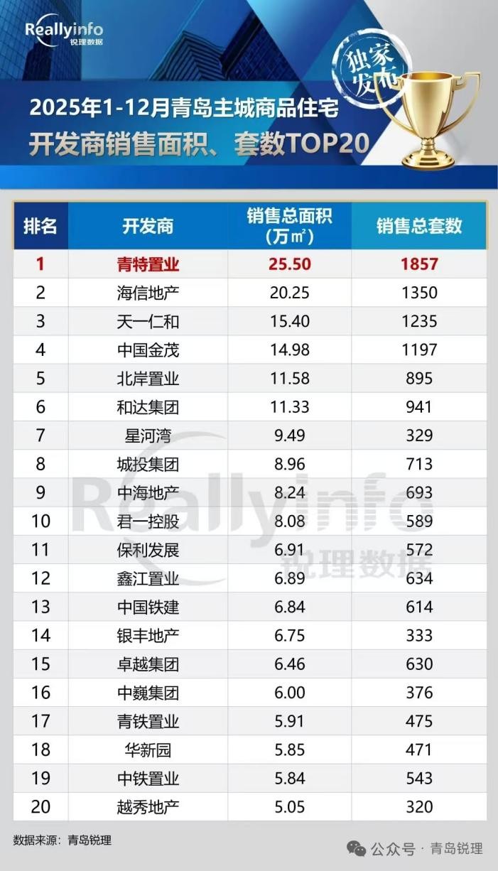青岛锐理数据显示,2025年青特以25.5万㎡成交面积、1857套成交,登顶青岛主城商品住宅面积、套数“双料销冠”;更是青岛TOP10房企中唯一连续两年保持业绩正增长的企业。