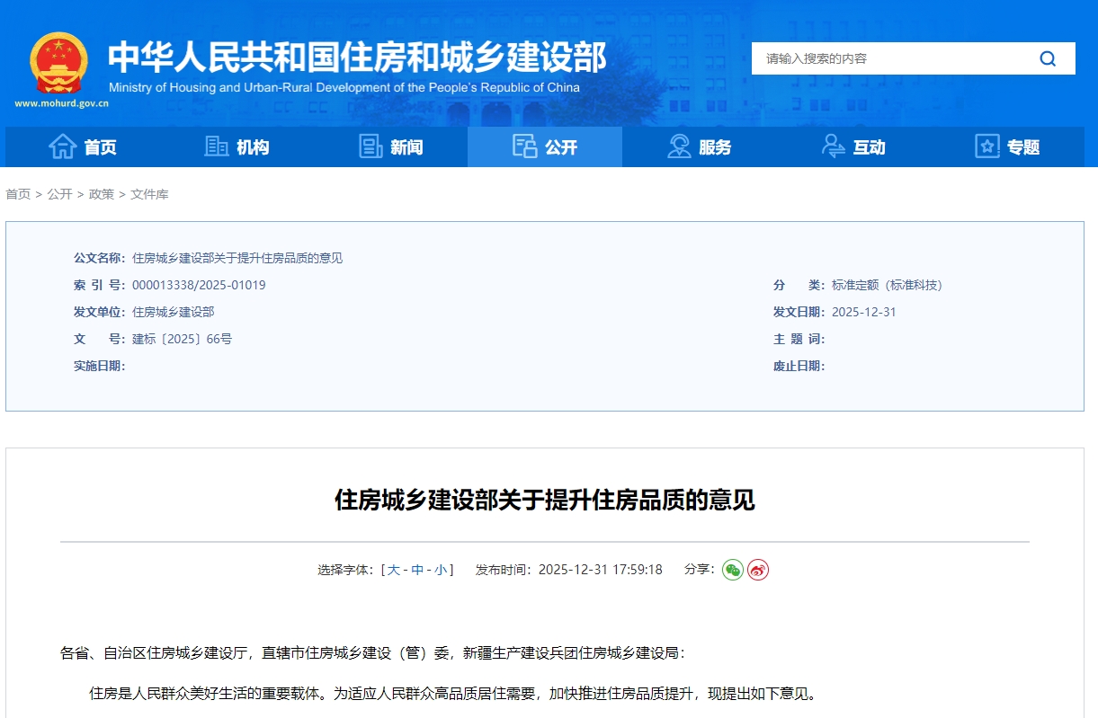 2025年12月31日,住房和城乡建设部发布《关于提升住房品质的意见》。意见明确了到2030年住房品质提升的总体目标:房屋品质提升工程取得显著进展,住房标准、设计、材料、建造、运维水平大幅提升,保障性住房率先建成“好房子”,商品住房更好满足刚性和改善性需求,老房子改造为“好房子”取得明显进展,形成有效支撑住房品质提升的政策体系、标准体系、技术体系和产业体系。