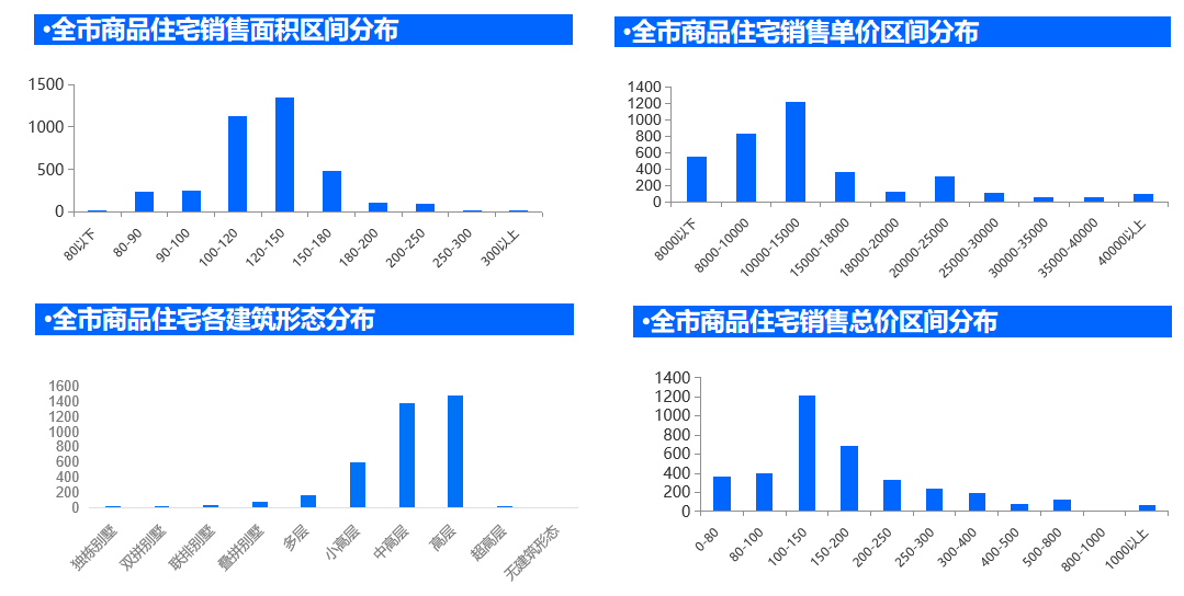 从面积来看,120㎡-150㎡住宅成交量最高;从单价来看,成交单价段集中于15000元/㎡以下;从建筑形态来看,高层、中高层成交表现较优;总价方面,100万-150万总价段住宅成交量较高。