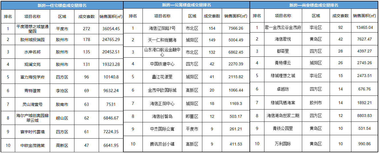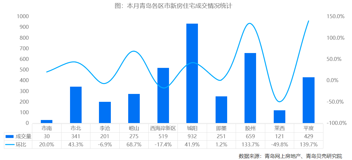从区市数据来看,12月新建住宅城阳区成交932套、胶州市成交659套、西海岸新区成交519套,位列成交量位居前三。