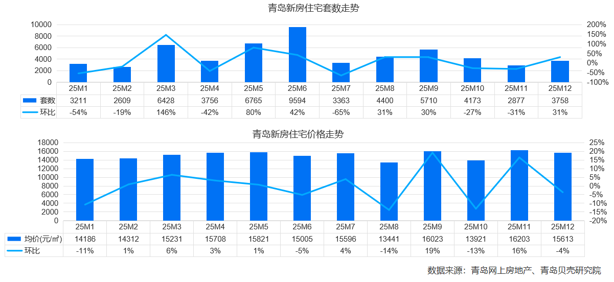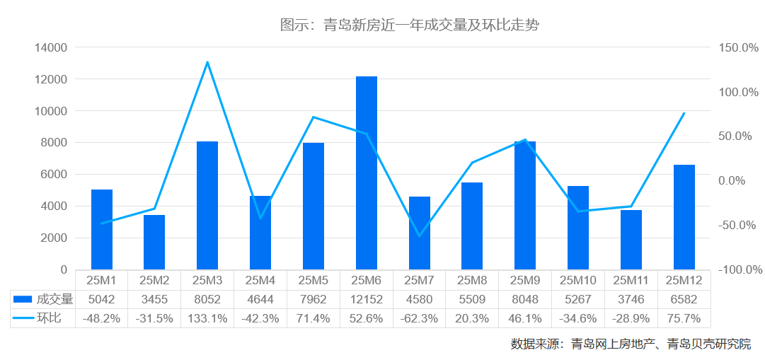 近日,青岛12月新房成交数据相继出炉,根据青岛网上房地产和青岛贝壳研究院统计,12月青岛市全市新房(包括住宅、公寓、商业、办公等)成交6582套,环比上涨75.7%。新建商品住宅成交3758套,环比涨31%;成交均价15613元/㎡,环比下降4%。