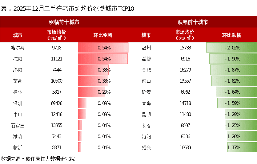 报告显示,哈尔滨和沈阳位居12月二手住宅价格环比涨幅前列,涨幅均为0.54%;绵阳、芜湖和桂林紧随其后,涨幅分别为0.33%、0.33%和0.29%;深圳、中山、石家庄、潍坊和临沂五个城市涨处于0.04%-0.09%之间。