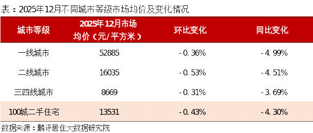 报告显示,2025年12月一线城市二手住宅市场均价为52885元/平方米,环比下跌0.36%,同比下跌4.99%;二线城市市场均价为16035元/平方米,环比下跌0.53%,同比下跌4.51%;三四线城市市场均价为8669元/平方米,环同比分别下跌0.31%、3.69%。