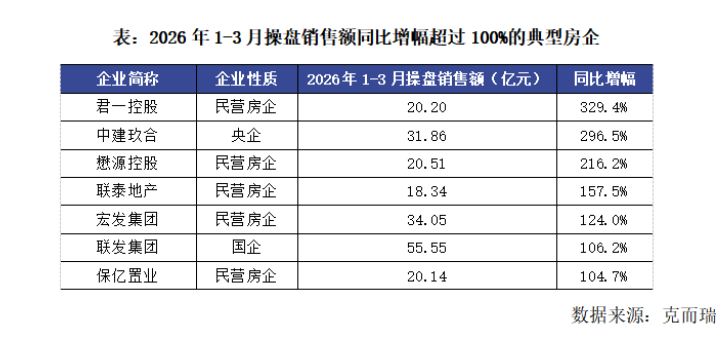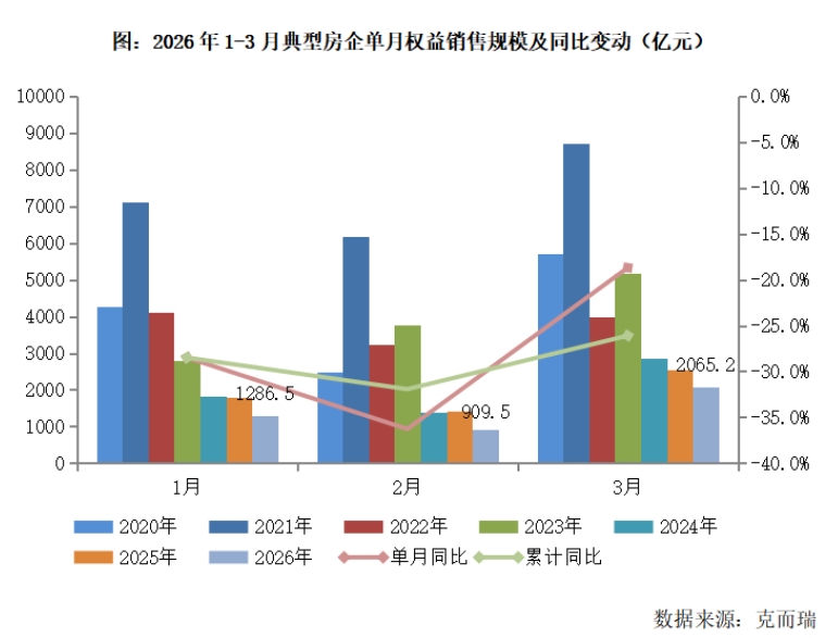 受益于假期积压需求释放,在2月春节月低基数下,3月“小阳春”初现。近日,克而瑞研究中心发布的报告显示,2026年3月,部分企业业绩大幅回暖,典型房企实现单月销售权益金额2065.2亿元,环比增长127.1%。