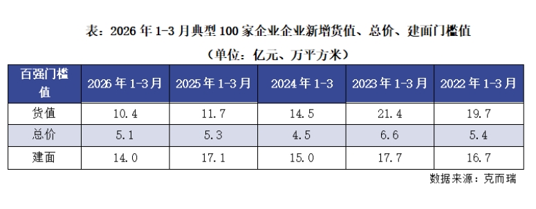企业投资方面,截至3月末,100家典型样本企业新增土地储备货值的门槛值为10.4亿元,较上月提高4%,同比下降11%,降幅较1-2月收窄近10个百分点;新增总价百强门槛值为5.1亿元,与去年同期基本持平。新增建筑面积百强门槛值为14万平方米,同比降幅较上月扩大至18%。