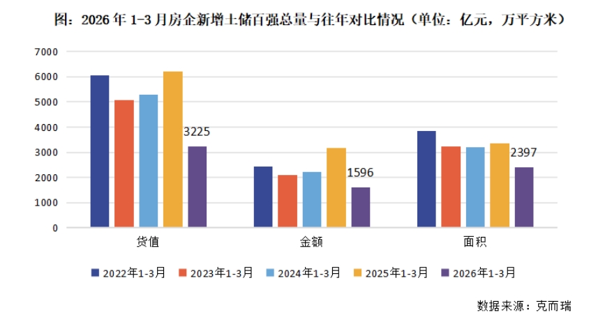 其中,新增土地储备的百强房企,其新增货值、总价及建筑面积百强之和分别为3225亿元、1596亿元和2397万平方米。与1-2月情况相比较,3月的拿地指标有明显恢复,但同比降幅较大。1-3月,货值、金额及面积同比分别下降48%、50%和29%。