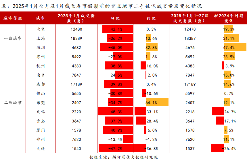 进一步来看,剔除春节影响,二手房成交仍具有一定的稳定性,成交量好于去年同期,数据显示,1月截至春节假期前(1.1~1.27)重点14城二手住宅成交95056套,较2024年同期上涨13.24%。