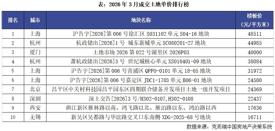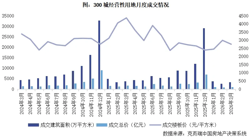 克而瑞发布的报告显示,截至2026年3月25日(下同),土地供应建筑面积为3117万平方米,环比持平,同比下降27%;成交3263万平方米,环比上升42%,同比上升30%。